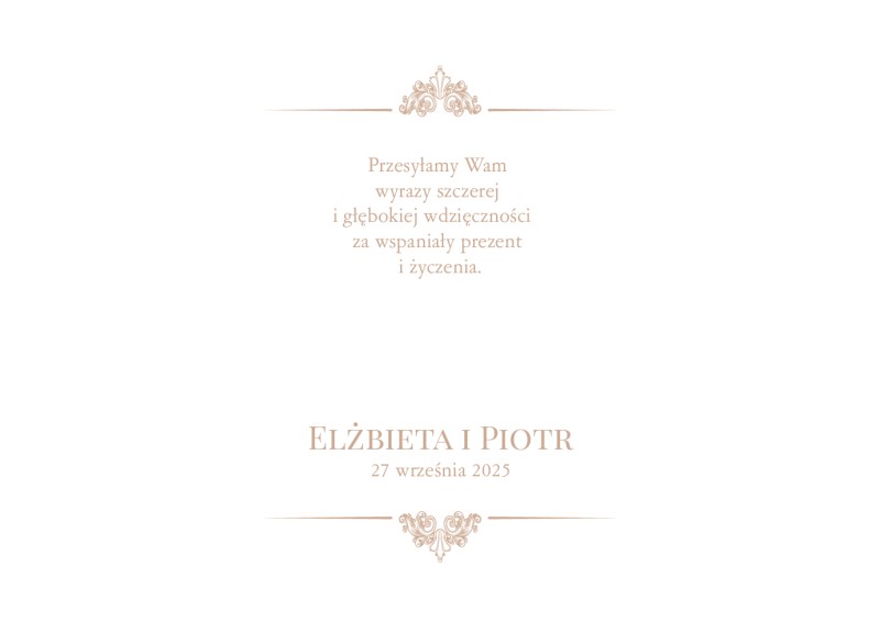 This wedding thank you card features a classic design in neutral tones. This pretty design also features ornaments and swirls.